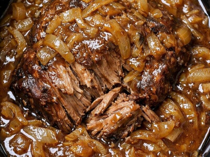 - Roll the roast on a bed of flour, making sure all sides are well-coated. Place the floured roast on top of a bed of onions in a 6-quart slow cooker.